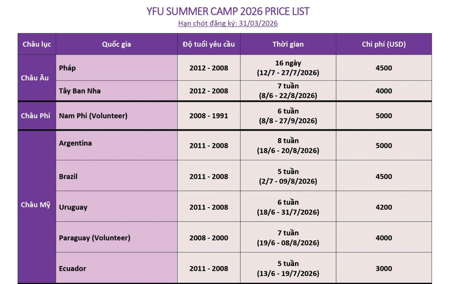 Bạn quan tâm đến văn hoá và ngôn ngữ; bạn muốn trải nghiệm, khám phá địa danh lịch sử hay bạn muốn tạo cho mình một CV Tình nguyện viên quốc tế đặc biệt? Hãy chọn một đất nước, một châu lục (châu Á, châu Âu, Nam Mỹ, Nam Phi) tham gia cùng bạn học từ khắp nơi trên thế giới để trải nghiệm thay đổi cuộc sống chỉ trong 2 đến 8 tuần Summer Camp Trại hè ngôn ngữ 2026!