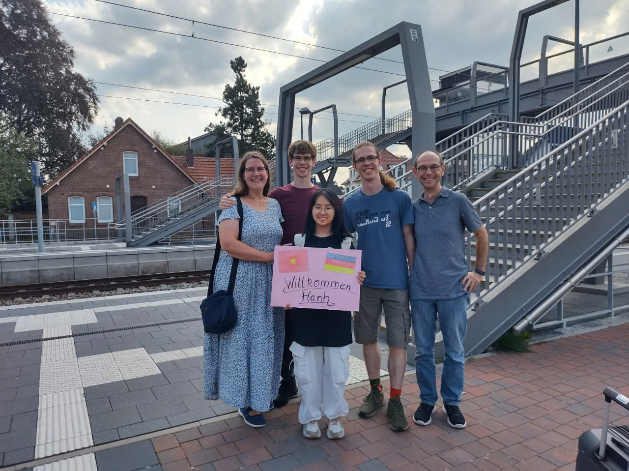 The Tapken family welcomed the Vietnamese exchange student at the train station. They held up a sign with the Vietnamese and German flags and the words in German "Welcome Hanh." From that day on, Hanh had a loving second family with German host parents and four siblings. To welcome their daughter by another mother from Vietnam, the family had spent two months preparing a beautiful private room for her with a study desk by the window, a pretty vase of flowers, a soft bed with pristine white sheets, a wardrobe, a small cabinet for her belongings, and a digital piano. Mama V. even found a small bicycle that fit Hanh's height so she could ride in the woods whenever she had free time.